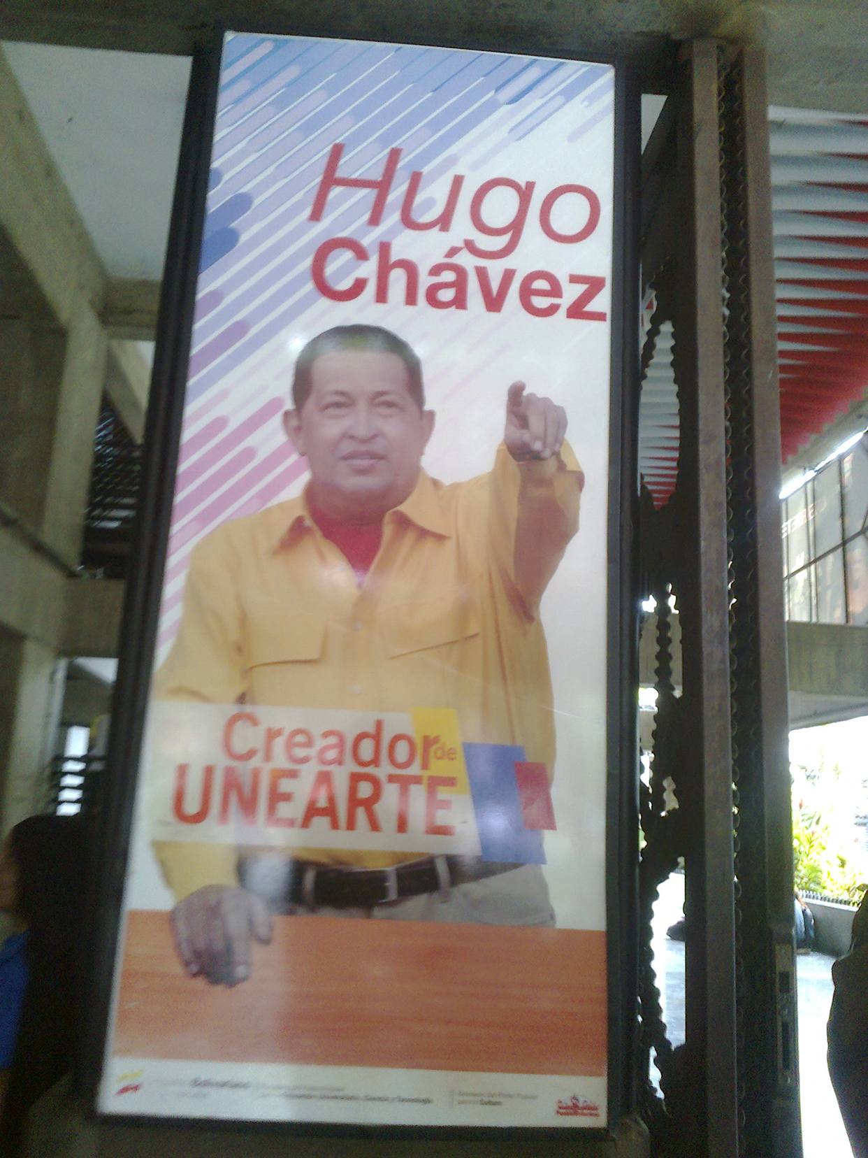 El Creador de Unearte saluda en la entrada. Camisa amarilla sobre una franela roja, señalando con al frente con su dedo índice. La imagen de Hugo Chávez, autodenominado creador, recibe a los estudiantes y profesores de la Universidad Nacional Experimental de las Artes y anuncia una entrada a un edificio que hasta 2007 fue la sede del Ateneo de Caracas. En este momento, el acceso a la estructura acompañado por la imagen chavista se encuentra revuelto por una representación de la parranda de San Pedro. El piso gris pulido del edificio y sus paredes gris concreto contrastan con las mallas de bailarines y piezas de obras de teatro que caminan y esperan el ascensor.»Sé tú mismo. Los deás pestos están ocupados.»